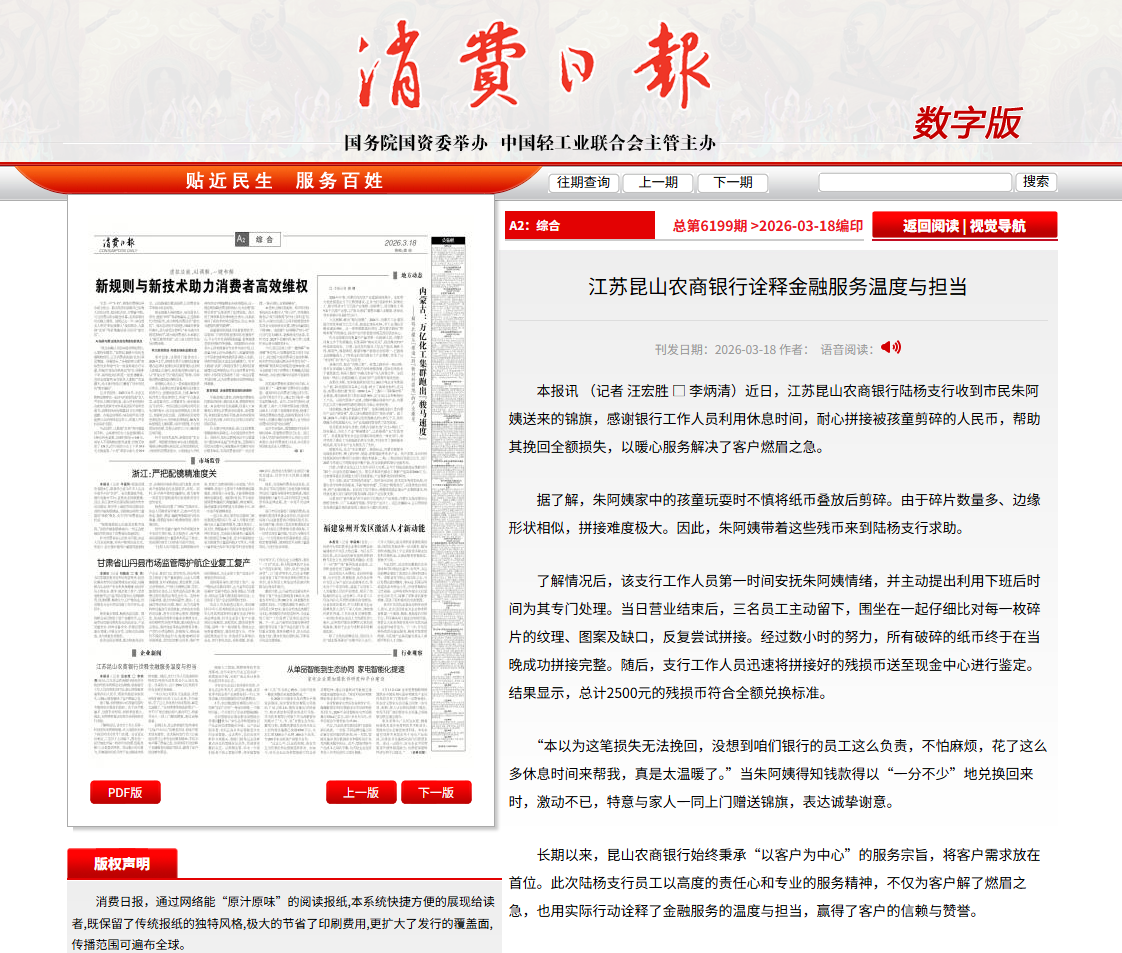 【消费日报】江苏昆山农商银行诠释金融服务温度与担当